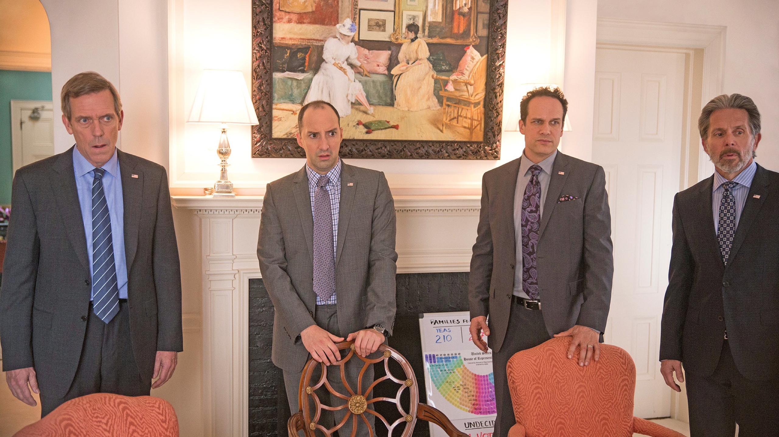 Ben, Kent, Ericsson, Mike and Gary go to discuss Moyes with Selina but discover she’s fallen asleep during her meeting with the Joint Chiefs. Tom walks in as Ben chastises Gary for agreeing to pay Amy and Dan. “Now we’re going to have to divert funds from the campaign and that’s fraud, and then we’re going to have to destroy the evidence and that’s conspiracy to commit fraud,” he says. Tom turns to leave, but Ben forces him to return, insisting that if he’s going down, Tom should, too. “Join the circle-jerk,” Ben tells him. “Grab a dick.” Selina wakes up in the middle of this revelation, but before she can muster the will to yell at everyone for implicating her, Kent informs her that the future of the bill now rests on one vote – that of Congressman Owen Pierce. “My future depends on that dumb f**king elf?” Selina asks.