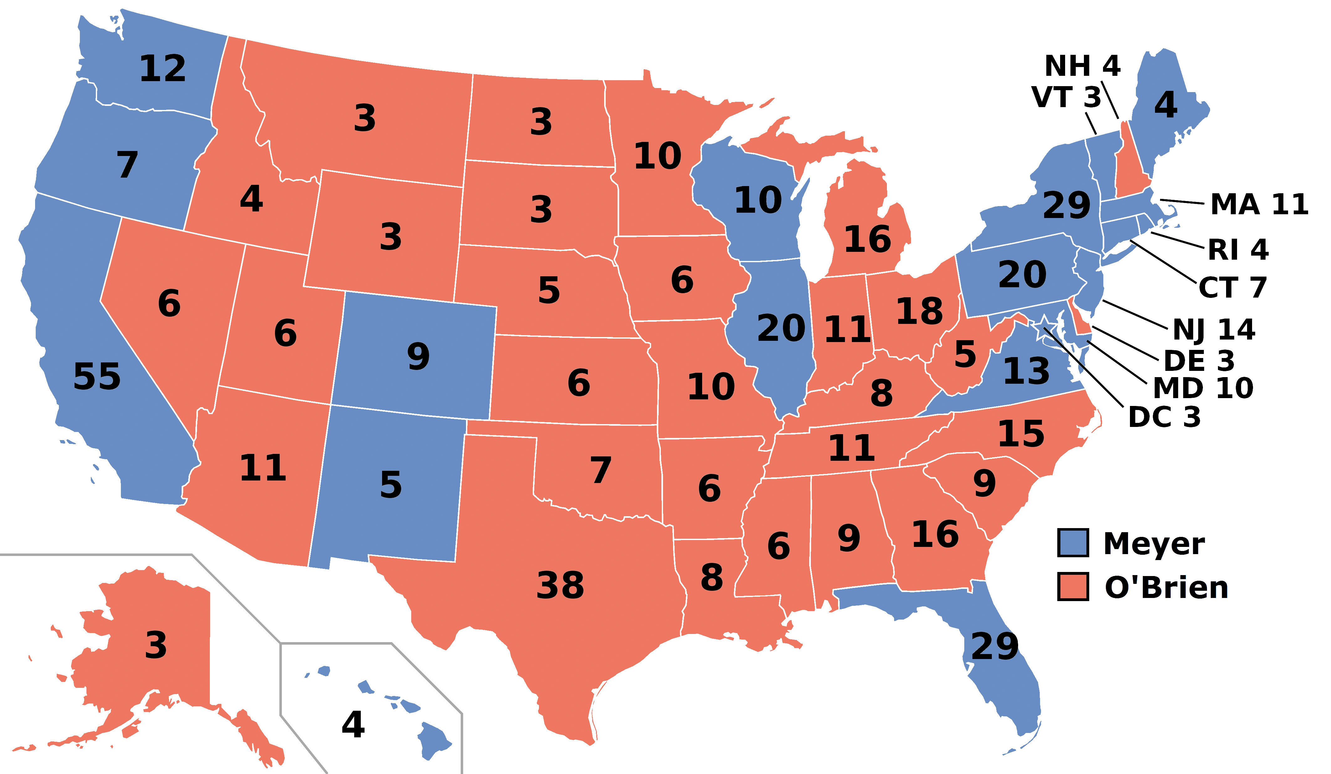 The Meyer-James ticket faced off against Arizona Senator Bill O'Brien and his running mate New Mexico Senator Laura Montez in the general election. The result on election night was a 269-269 electoral tie, leaving the presidency to be decided by congress. Meyer was projected to win the popular vote on election night. In the state of Nevada, returns showed that O'Brien's lead was less than half a percent, which by state law allowed for a recount. It was revealed that an anti-Meyer postal employee had hoarded ballots. The ballots skewed heavily towards O'Brien, extending his lead in the state and allowing him to surpass Meyer in terms of the national popular vote.