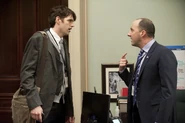 Dan has lunch with Sidney Purcell who orders the most expensive items on the menu - for each of them - since it's on Dan's tab. He coerces Dan into revealing crippling information about everyone in the VP's office in exchange for a job, but then reveals there isn't one. "Why don't you take your little vanilla thriller dance over to Danny Chung? He's the shiny turd rising to the top of the bowl right now. You like turds, don't you Dan?"